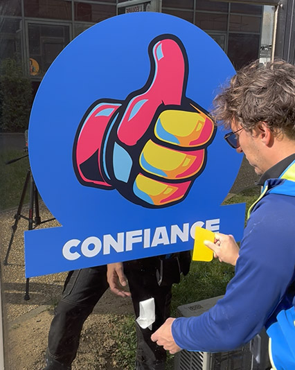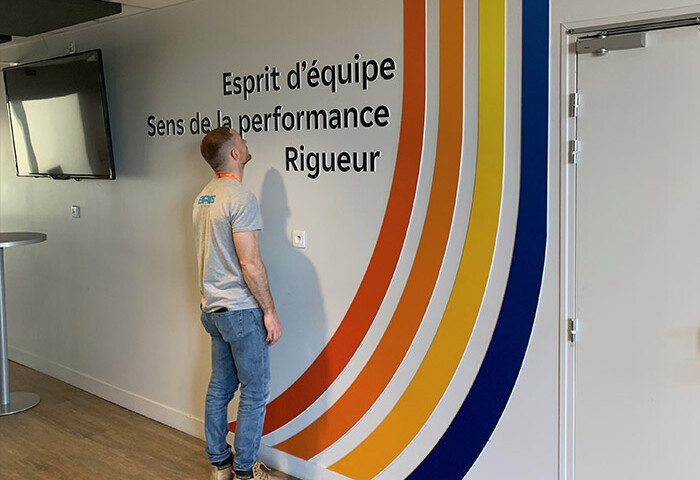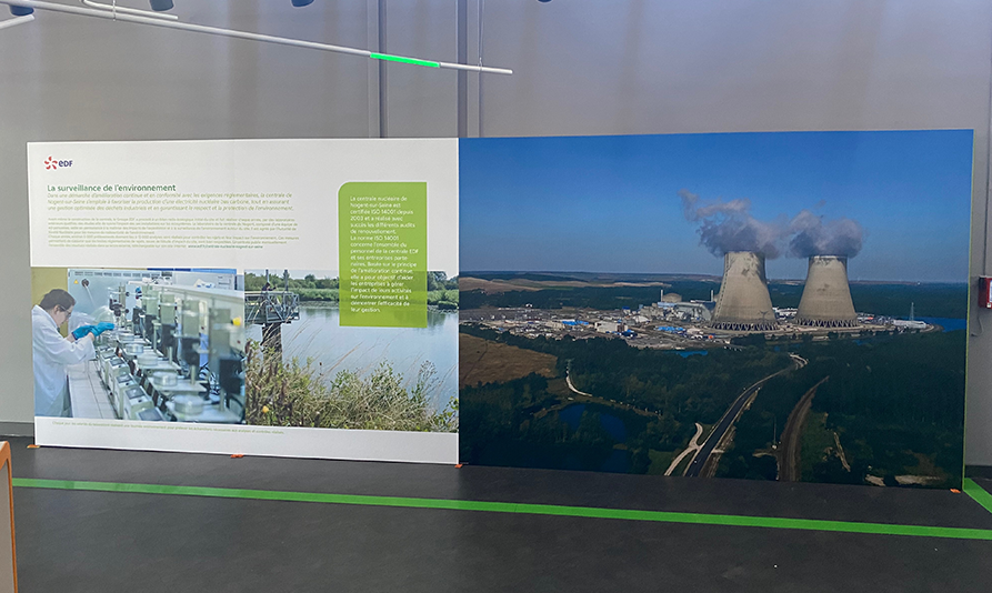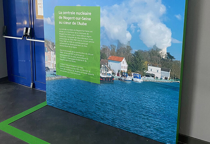 Différents exemples de déploiement d’identités graphiques sur les site de production EDF (centrales nucléaires). Nos équipes sont habilitées à travailler en zone contrôlée, en utilisant des supports variés : vitrophanie, pvc découpé, totems impression bois. Selon les usages, la conformation des lieux, l’emplacement ( intérieur ou extérieur ), nous ajustons !