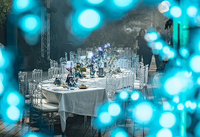 Mise en lumière des extérieurs et de l’intérieur de la Serre. Disposition d’une grande tablée serpentine avec assises transparentes pour accentuer les jeux de lumière.